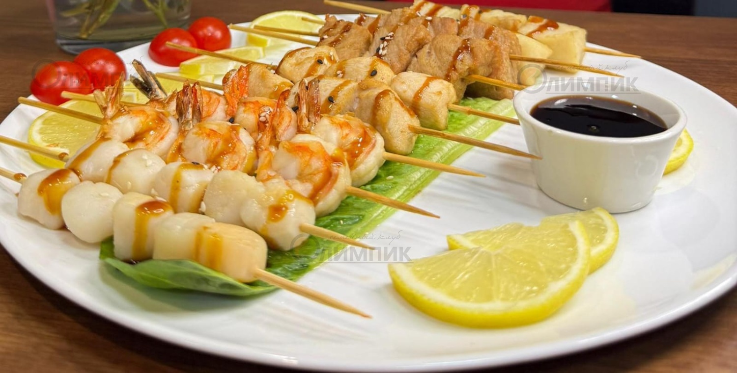 Состав: яки-шашлычки: тунец, куриное филе, гребешок, креветка, лосось